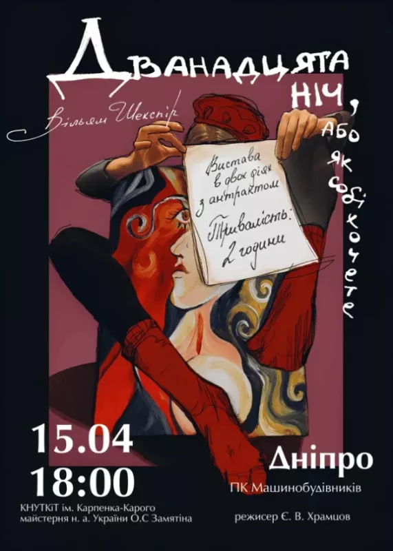 Вистава за п’єсою Вільяма Шекспіра "Дванадцята ніч, або як собі хочете" від студентів КНУТКіТ ім. І.К. Карпенка-Карого (майстерня О.С. Замятіна) пройде в Дніпрі!