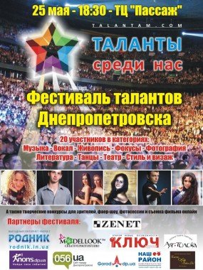 Проект «Таланты среди нас», стартовавший в конце марта, набирает обороты. В ближайшую субботу состоится первый Фестиваль талантов Днепропетровска. В центре города на площади возле ЦУМа и ТЦ "Пассаж" соберутся самые смелые интересные участники проекта "Таланты среди нас", чтобы показать миру свои таланты. Такого многообразия красивых творческих людей вы не увидите больше нигде!