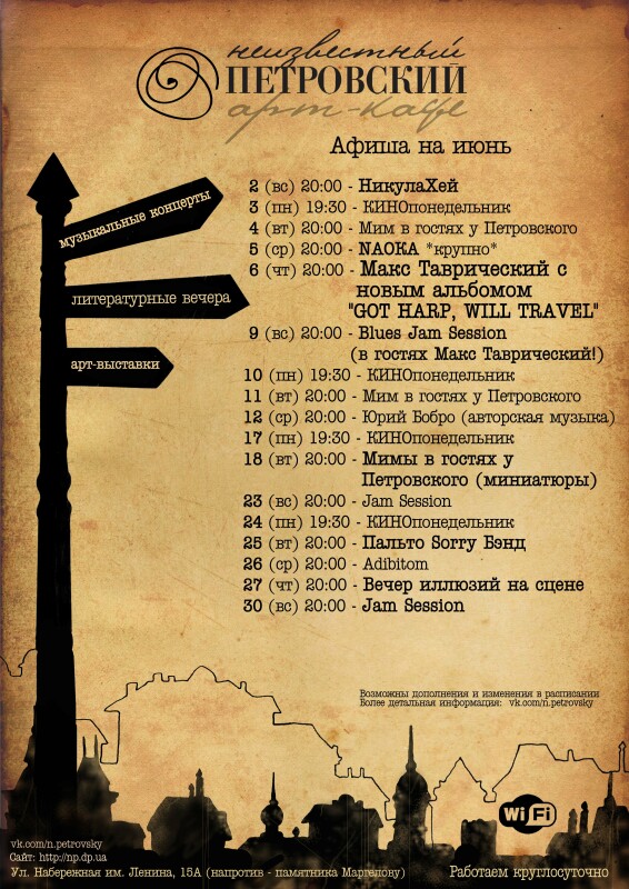Живая музыка, интересные конофильмы, выступления мимов помогут Вам отдохнуть в компании хороших друзей.