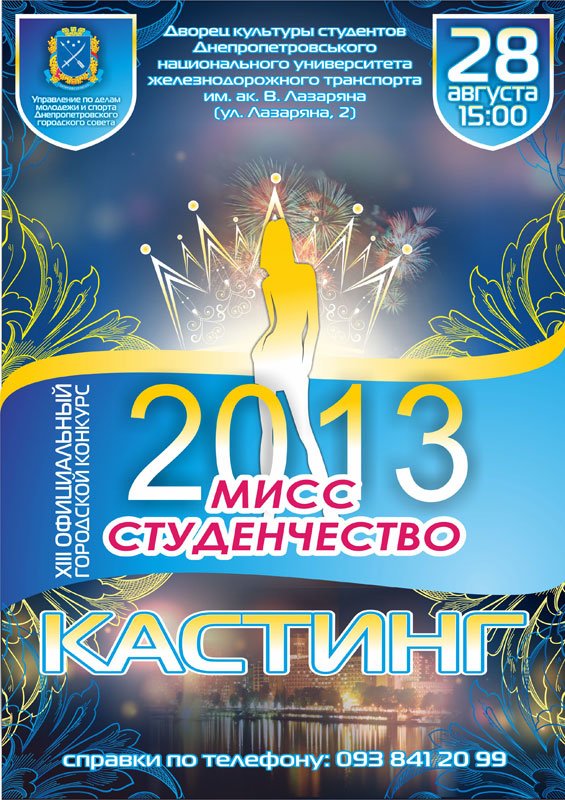 Запрошуємо на кастинг XIIІ офіційного міського конкурсу краси та таланту «Міс студентство – 2013». Для участі у кастингу від дівчат необхідно бути студенткою одного з вишів Дніпропетровська, вчасно подати заявку та взяти участь у відбірковому турі. За декілька годин кастингу всі конкурсантки повинні встигнути розповісти про себе і під час дефіле показати свої здібності.