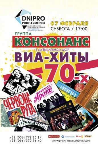 Музыкальное шоу "ВИА-хиты 70-х" - это новый проект группы «Консонанс»! В нём представлены лучшие песни вокально-инструментальных ансамблей и музыкальных групп 70-х годов 20 века в новой аранжировке! Кавер-версии на нестареющие хиты «Битлз» и «Самоцветов», «Землян» и «Веселых ребят» соединились в динамичном и красочном калейдоскопе!
