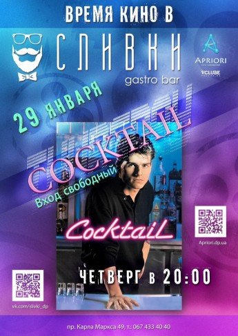 Время Кино в Сливки Gastro Bar! Еженедельно в четверг вечером, мы будем предоставлять вашему вниманию интересные фильмы. Кино которое оставит след и ощущение приятного время препровожде́ния за парочкой оригинальных коктейлей!