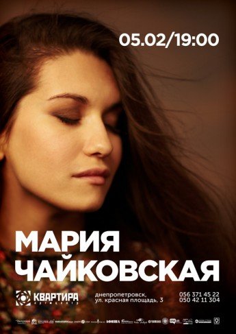 Мария Чайковская - украинская певица, пианистка, автор-исполнитель песен, из которых многие стали интернет-хитами "Не уходи", "Мосты", "Пистолеты и розы", "Забери меня", "В городе остывших морей", "В комнате цветных пелерин", "Нитью", "Лифты", "Ева", "Душа", "Крила"