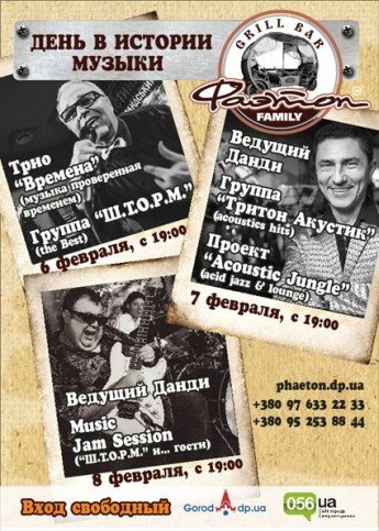 8 февраля, в воскресенье, завершит уик-энд музыкальный Jam Sassion. Гриль-бар “Фаэтон” и группа “Ш.Т.О.Р.М.”приглашает гостей-музыкантов. Все вместе они и ведущий вечера — шоу-мэн Данди поведают Вам много интересного о музыке, и о музыкантах.