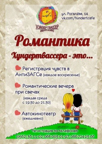 Бронирование автокинотеатра, столика при свечах и регистрации в АнтиЗАГСе по тел.: (056) 36-11-02 или 066 724-23-66