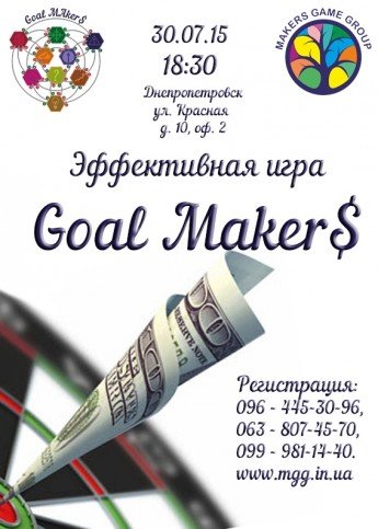 «Goal MAker$» дает дополнительную возможность познакомиться с новыми людьми, завязать личные и бизнес-знакомства, воспользоваться опытом и видением других участников игры относительно своей цели, получить качественную обратную связь от ко-ведущих (авторов «Goal MAker$») и других участников.