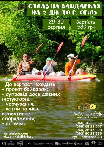 Збираємося дводенний тур на байдарках по річці Оріль. Ми будемо дихати свіжим повітрям, плавати у прохолодній чистій річці, насолоджуватись красою природи, їсти смачну їжу приготовлену на кострі, і звичайно сплавлятись на байдарках.