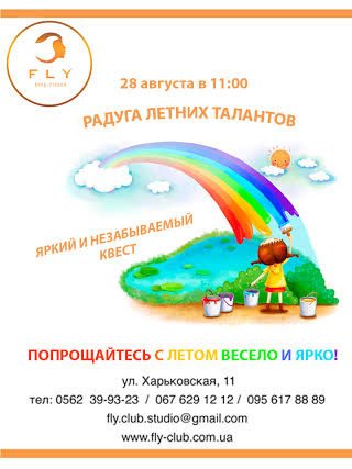 Это лето было цветным, дружным, веселым, жарким и богатым на хорошие впечатления! Давайте сделаем лету напоследок подарок. Мы приглашаем всех друзей клуб-студии FLY на квест «Радуга летних талантов». Ведь там, где кончается радуга, спрятано ведро золотых момент и разные таланты.