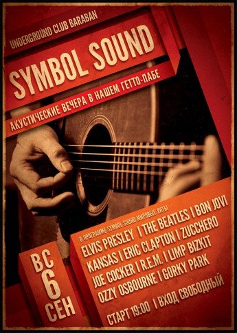 Для открытия нового акустического формата мы позвали наших хороших друзей - команду Symbol Sound. Они порадуют тебя акустическим исполнением мировых хитов: Elvis Presley, The Beatles, Bon Jovi, Kansas, Eric Clapton, Zuccero, Joe Cocker, Limp Bizkit, Ozzy Osbourne, Gorky Park и другие.