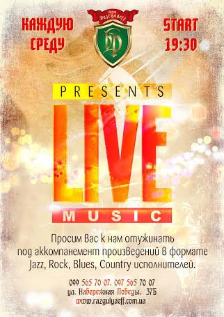 Приглашаем отужинать под звуки знаменитых хитов в формате: Jazz, Rock, Blues, Country.