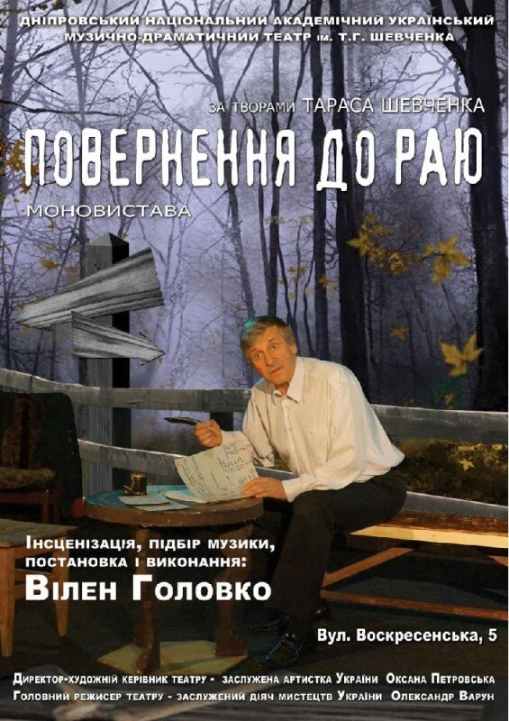 27 травня 1858 року Т.Шевченко прибув до Санкт-Петербурга. Та тільки в який «рай» повернувся? Глядачі зможуть ще раз перегорнути окремі сторінки життя поета у десятилітньому засланні, коли він був рядовим 5-го лінійного батальйону окремого оренбурзького корпусу, пізнати краще «невідомого» тоді та нвстыльки актуального сьогодні Шевченка. Багато декорацій не сцені немає, проте вагоме значення має звуковий ряд, який підібрав постановник вистави і виконавець ролі Т.Шевченка – провідний майстер сцени Вілен Головко. У виставі звучить В.-А.Моцарт, М.Глінка, П.Чайковський, народні пісні. При створенні спектаклю використано першоджерела: щоденники, поезію різних років. Виконується мовою оригіналу.