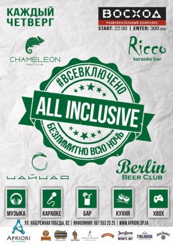 Каждый четверг в РК Восход! All inclusive - это Шведский стол: 4 кухни (Италия, США, Япония, Украина)! Безлимитный бар! Всю ночь!