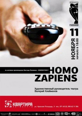 Ждем вас на спектакле "Homo Zapiens", который расскажет вам о Человеке, который становится пультом управления в руках телевидения. О Человеке, которым управляют средства массовой информации, о человеке "переключателе"...