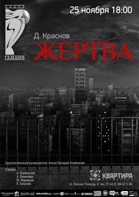 Театр «Гамаюн» приглашаюет вас посмотреть детективную драму «Жертва», которая поставлена по пьесам Дмитрия Краснова. В спектакль вошли три пьесы Дмитрия Краснова: «Ограбление», «Проводница» и «Жертва».