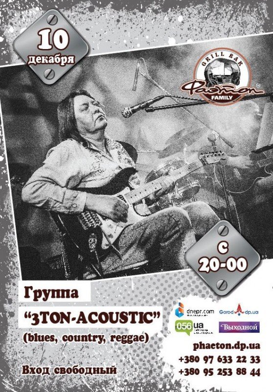 Вечер четверга, 10 декабря, заполнится удовольствием от прослушивания неувядаемых хитов, твердых нот в стилях reggae, country и blues, авторских и фирменных подач от нашиъ Гостей сцены - группы “3ton-acoustic”. Вы получите уйму наслаждения от услышанного и увиденного в гриль-баре «Фаэтон»!
