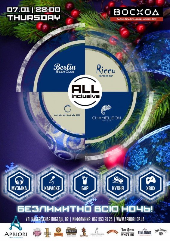 Каждый четверг в РК Восход! All inclusive - это Шведский стол: 4 кухни (Италия, США, Япония, Украина)! Безлимитный бар! Всю ночь!