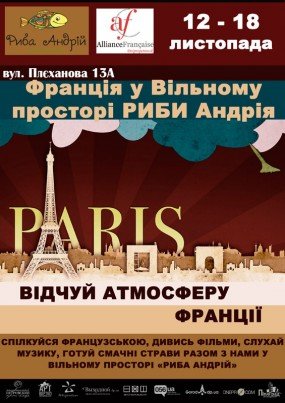 Мріяв побувати у Франції? Туристичний центр "Риба Андрій" запрошує тебе відвідати Францію відтворену у Вільному просторі. Впродовж тижня, з 12 по 18 листопада, відвідай Вільний простір "Риба Андрій" та відчуй атмосферу Франції.
