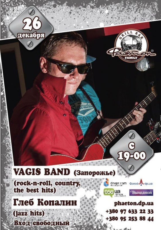 Суббота, 26 декабря, будет очень яркой, и для тех, у кого не вышло побывать у нас в прошлую субботу, мы специально повторим этот отрыв и этот рок-н-ролльный манер! Гости из г. Запорожья желают удивить Вас вновь! Итак, на сцене гриль-бара виртуозы, даже мы сказали бы, фанатики своего дела — яркие и неутомимые VAGISBAND. В тандеме с нашим любимцем публики – Глебом Копалиным, музыканты подарят Вам вечер настоящего наслаждения и отдыха!