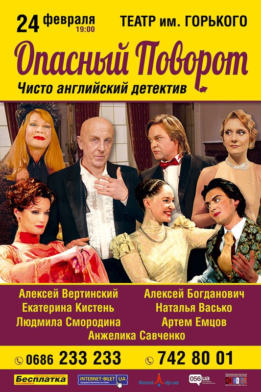 КСТАТИ... Пьеса «Опасный поворот» была создана Д.Б.Пристли в 1932-м. И стала стартом его международной известности в мире театра. Со временем эта пьеса была переведена на многие языки, обрела невиданную популярность. Только в Украине ее словно бы обходили стороной. Широко известна телевизионная версия драмы: знаменитый телефильм Владимира Басова середины 70-х с участием Юрия Яковлева, Валентины Титовой, Антонины Шурановой. Намного раньше, в 1939-м, пьесу открыл для бывшего СССР гениальный режиссер Григорий Козинцев - на сцене Ленинградского театра комедии.