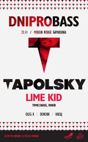 Ди джей Тапольский возвращается на Родину! 10 лет назад Анатолий покинул украинскую столицу драмнбейса - Днепропетровск и направился в город-герой Киев. За эти годы была проведена полная bass капитуляция страны, от запада до востока и с юга на север. Украина стала бейс країною и пришло время восстановить справедливость и былую славу прекрасному городу на Днепре. 23 ноября Анатолий и Александра Лайм Кид выступят перед жителями города в клубе Moulin Rouge.