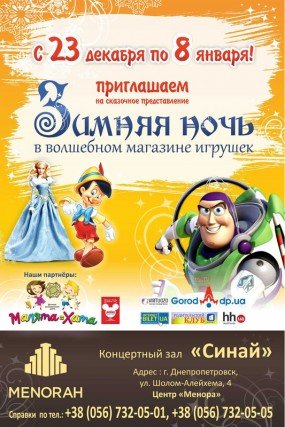 В период зимних каникул в Центре «Менора» будет проходить музыкально-театрализованный детский спектакль «Зимняя ночь в магазине игрушек». Маленькие зрители смогут погрузиться в сказочную атмосферу праздника и получить море удовольствия. Спектакль не оставит равнодушными ни детей, ни взрослых!