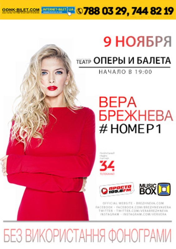 Одна из самых утонченных и ярких исполнительниц – Вера Брежнева отправляется в тур #Номер1. Певица, актриса и посол доброй воли ООН, представляет специальную программу «#Номер1», в которую вошли самые любимые песни с альбомов «Любовь спасет мир» и «Ververa».