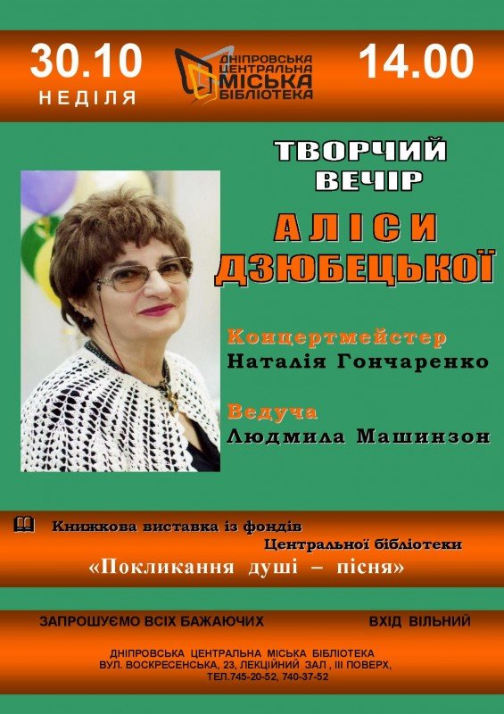 Дніпровська Центральна міська бібліотека запрошує всіх бажаючих прийняти участь в літературно-музичній програмі, присвяченій творчості Аліси Дзюбецької.