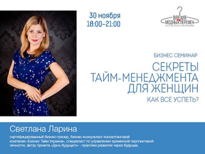 Светлана Ларина – сертифицированный бизнес-тренер, бизнес-консультант консалтинговой компании «Бизнес Тайм Украина», специалист по управлению временной перспективой личности, автор проекта «День будущего» - практики развития через будущее.