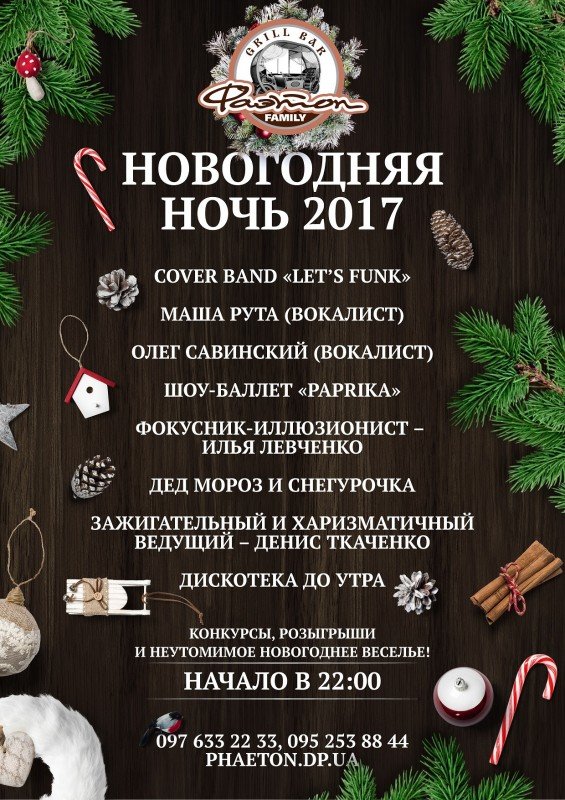 Каждый человек предвкушает в эту ночь что-то светлое, необычное и волшебное. Именно поэтому мы приглашаем и ждем Вас в Новогоднюю Ночь в гриль-баре «Фаэтон», дабы отвлечь Вас от трапез приготовлений и новогодней суеты. Мы подготовили яркую, праздничную и самую интересную новогоднюю программу в стиле Hollywood. В эту ночь для Вас поет и играет неутомимый Cover BAND «Let's FUNK», обворожительная Маша Рута, харизматичный и зажигательный Олег Савинский. Подымает и зажигает шоу-баллет «Paprika», творит и удивляет фокусник-иллюзионист — Илья Левченко. Непреммено, к нам в Гости через сугробы и вьюги заберется Дед Мороз со Снегурочкой! А не давать покоя празднованию и веселью будет наш задорный Ведущий – Денис Ткаченко.