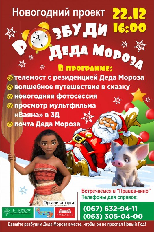 22 декабря кинотеатр «Правда-Кино» приглашает всех детей и взрослых на новогодний праздник «Разбуди Деда Мороза» и премьеру мультфильма «Ваяна» в 3Д.