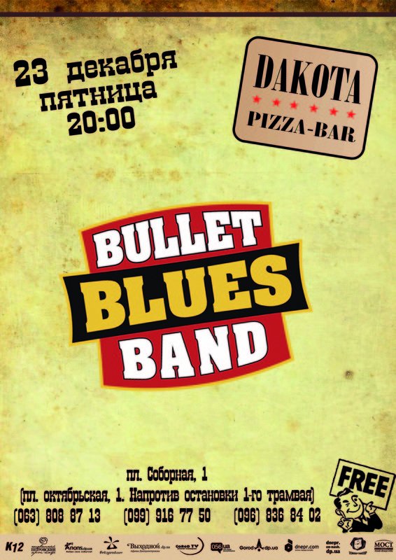 23 декабря (пятница) DAKOTA Pizza-bar приглашает любителей блюза на выступление группы Bullet Blues Band. Лучшие песни эпохи "Чикагского блюза" прозвучат на сцене DAKOTA.