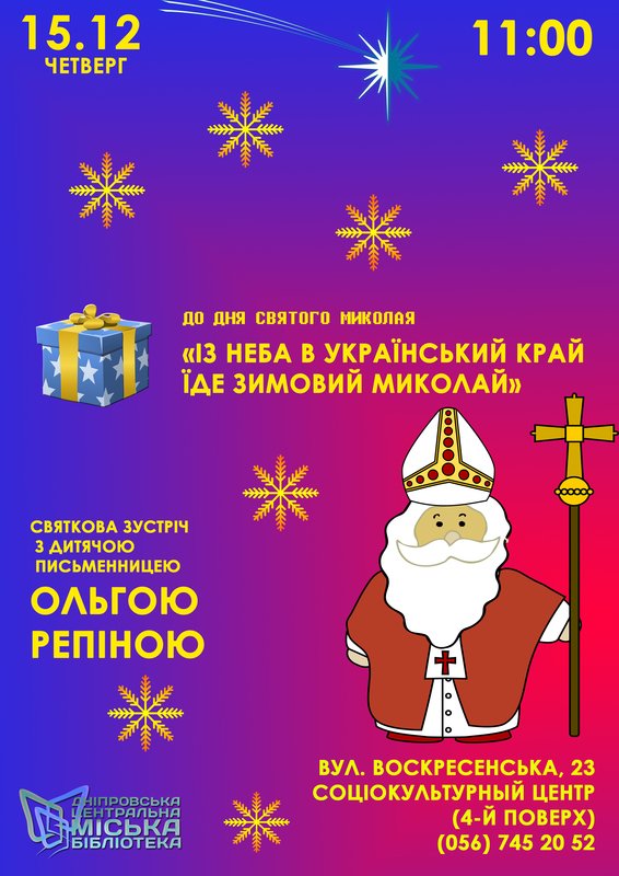 Дніпровська Центральна міська бібліотека міста запрошує дітей та дорослих прийняти участь у святкуванні дня Святого Миколая. Присутні матимуть нагоду познайомитись із відомою дніпровською дитячою письменницею та психологом Ольгою Репіною.