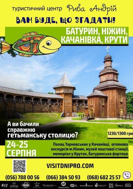 Ми побуваємо у Батурині – давньому місті, що було резиденцією багатьох гетьманів Лівобережної України. На вас чекає захоплива екскурсія історичним центром міста, відвідування Батуринської фортеці, будинку-музею В. Кочубея та ще багато цікавого.