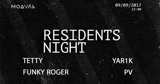 Resident Night — регулярная серия вечеринок, участниками которых являются диджеи с днепровской пропиской. Обязательные условия присутствия в лайн-апе серии — хороший вкус, актуальный саунд, отменная техника, соответствие музыкальному формату Модуля.