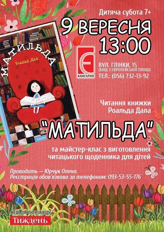 Книгарня «Є» запрошує батьків та дітей на читання книжки Роальда Дала «Матильда» та майстер-клас з виготовлення читацького щоденника. Захід відбудеться 9 вересня.