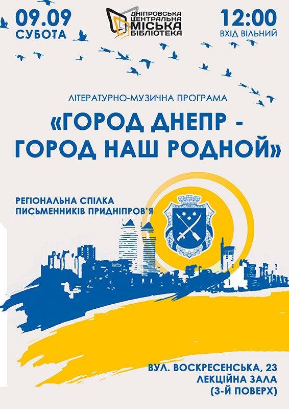 Центральна міська бібліотека та Регіональна спілка письменників Придніпров’я запрошують всіх бажаючих на літературно-музичну програму до дня міста «Город Днепр – город наш родной».