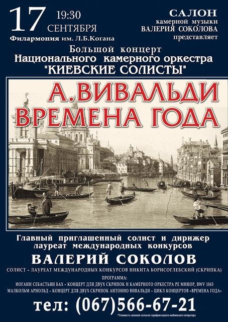 С декабря 2016 года Валерий Соколов приглашен к сотрудничеству с национальным камерным оркестром «Киевские солисты» в качестве художественного руководителя и дирижера. 18 сентября в первом вечере «Музыкального салона Валерия Соколова» в исполнении национального камерного оркестра «Киевские солисты» - ведущего бренда современной музыкальной культуры Украины – прозвучит цикл концертов «Времена года» Антонио Вивальди.