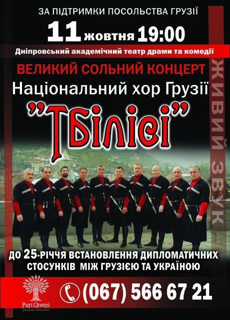 Национальный хор Грузии «Тбилиси» - это 12 вокалистов: шесть теноров, три баритона и три басы. Руководитель коллектива - заслуженный деятель искусств Грузии, лауреат Государственной премии Роберт Гоголашвили. Директор хора - кавалер Ордена Чести Заза Мамаладзе. В репертуаре ансамбля - грузинские народные песни, песни грузинских композиторов, а также известные мелодии из кинофильмов (в частности, «Мимино», «Скрипач на крыше»), с бродвейских мюзиклов ... А специально для тура по Украине в репертуаре хора «Тбилиси» появилась песня на стихотворение Тараса Шевченко «Реве и стонет Днепр широкий». Но это еще не все песенные сюрпризы, которые ожидают украинскую публику во время двухчасовых концертов.