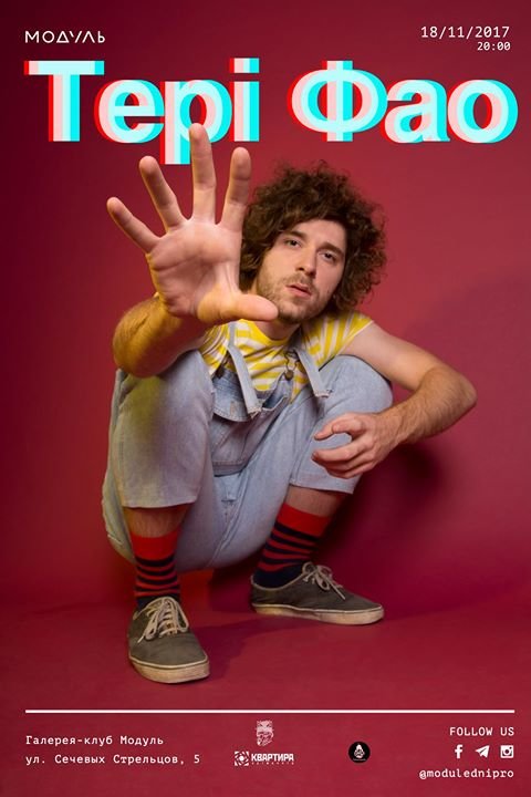 Терри Фао - исполнитель из Киева, который начал свою деятельность в 2014 году, и является ярким представителем новой волны украинской инди, 18 ноября представит новый EP «Запах моря» (https://soundcloud.com/terry_phao/sets/ter- fao-zapakh-morya) в Днепре в клубе Module.