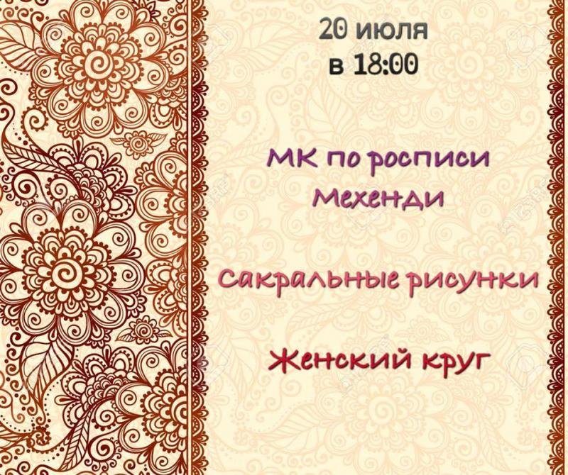Мы познакомимся с техникой и значением сакрального мехенди, окунемся в творческий процесс, научимся рисовать чувствуя, расслабимся и отдохнем от городской суеты и наполнимся женскими энергиями в кругу единомышленниц.