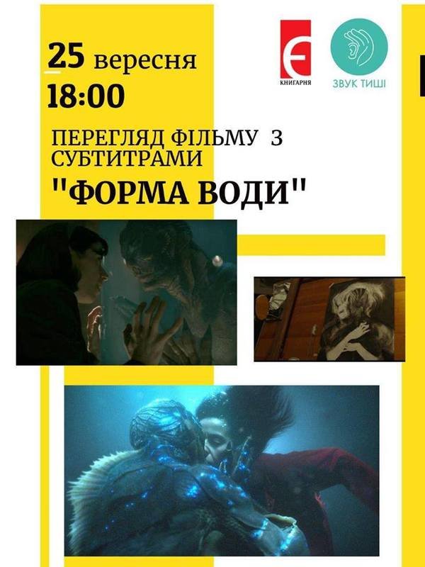 "Звук тишины" и Книжный магазин "Э" приглашает глухих и всех желающих на просмотр оскароносного фильма "Форма воды» (реж. Гильермо дель Торо; США; 119 мин) с субтитрами и обсуждением после фильма. Мероприятие состоится 25 сентября. Начало - в 18 : 00.