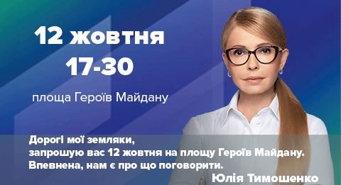«Дорогие мои земляки, приглашаю вас 12 октября на площадь Героев Майдана. Уверена, нам есть о чем поговорить », - Юлия Тимошенко.