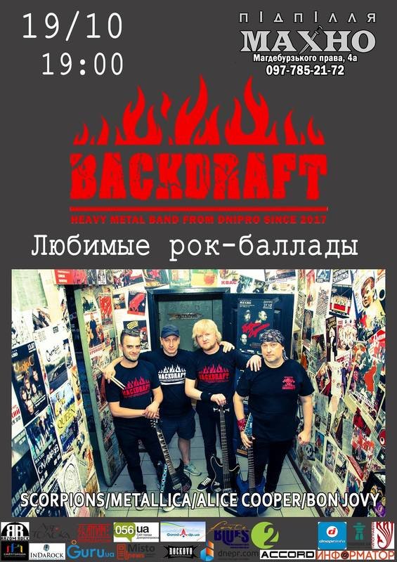 Драйвовая группа «Backdraft» зажжёт романтический вечер в Махно. В программе — подобранные с особым вкусом яркие рок-композиции, создающие особое настроение и оставляющие впечатление надолго! «Backdraft» исполнят лучшие баллады таких групп, как Scorpions, Bon Jovi, Metallica, Guns’n’roses, Limp Bizkit, RHCP, Alice Cooper и многих других. Приходите отдыхать, петь и танцевать вместе с «Backdraft»!