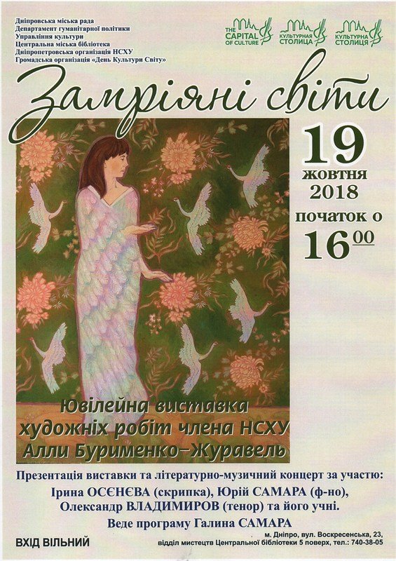 Приглашаем всех желающих на презентацию юбилейной выставки художественных работ члена НСХУ Аллы Бурименко-Журавель «Замечтавшиеся мира».