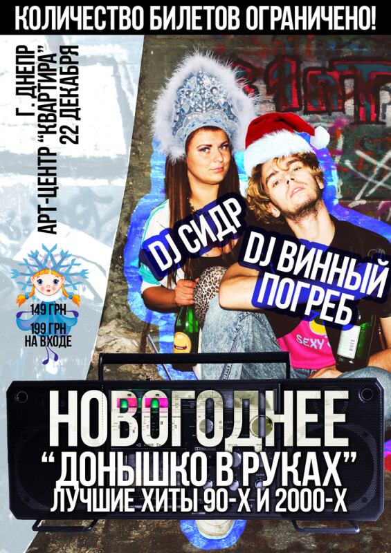 Короли вина и покорители винампа! Рыцари танцев на колонках! Во время своего осеннего визита "Донышко в руках" собрали такой переаншлаг, что в клуб не поместилась почти половина желающих! Теперь DJ Сидр и DJ Винный Погреб возвращаются в Днепр с лучшими новогодними хитами!