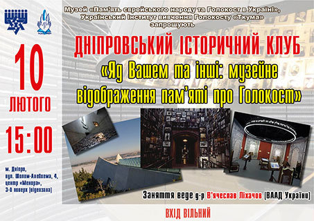 Где и когда возникли первые музеи, посвященные истории Холокоста? Какой была концепция Мемориала Катастрофы и Героизма Яд Вашем (Израиль) и какое место в нвй занимает трагедия еврейского народа на украинских землях во время Второй мировой войны? О чем рассказывают экспонаты и или молчат о чем-то музейные экспозиции? Много интересных вопросов лектор раскроет во время интерактивного занятия.