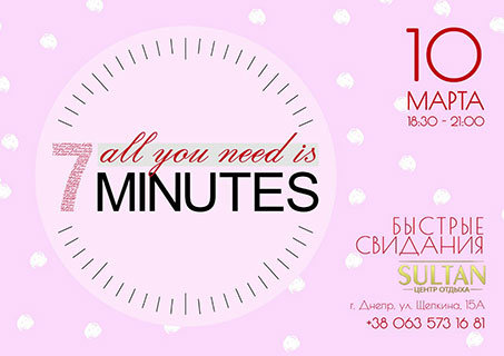 В современном мире найти свою вторую половинку очень не просто! Но это дилемма, которую в наших силах разрешить! Мы, компания «7 minutes», полны уверенности в правильности нашего выбора, который поможет объединить два сердца и заставит их биться в унисон! Решение гениально и просто: Speed Dating!