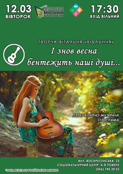 12 марта в 17:30 творческая гостиная "Эхо" приглашает поэтов, бардов и всех поклонников и ценителей истинной поэзии, художественного слова и авторской песни на очередное заседание "И снова весна, смущает наши души ...", которое на этот раз целиком посвящено весенней тематике.