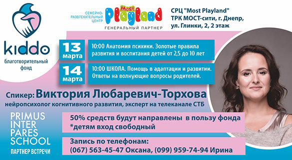тематическими встречами в Днепр приезжает Виктория Любаревич-Торхова (г. Киев) - ведущий психолог проекта телеканала СТБ "Дорогая, мы убиваем детей", бакалавр психологии, магистр нейропсихологии когнитивного развития в Великобритании, автор статей и обучающих программ в направлении практической психологии. Её приезд в наш город - событие уникальное, которое невозможно пропустить!