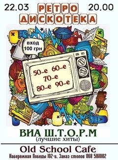 Неизменные резиденты Old School Cafe, ВИА Ш.Т.О.Р.М, отлабают программу с лучшими хитами всех времен и народов с 50-х по 90-е годы прошлого века. По окончании, непосредственно дискотека, с не менее крутыми хитами!
